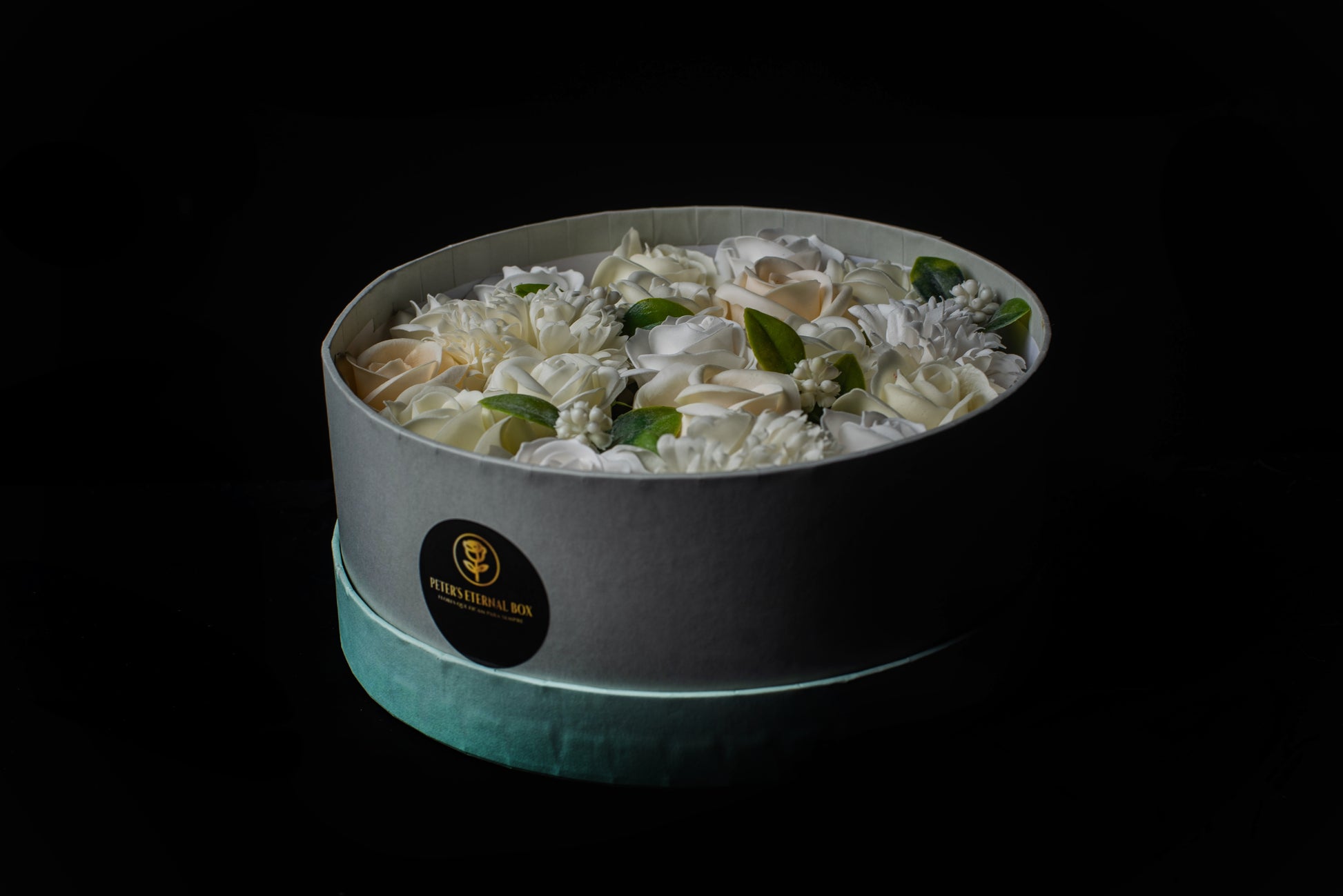 ✨ Luxuosa caixa de flores em resina em tons suaves — luxo que não murcha.