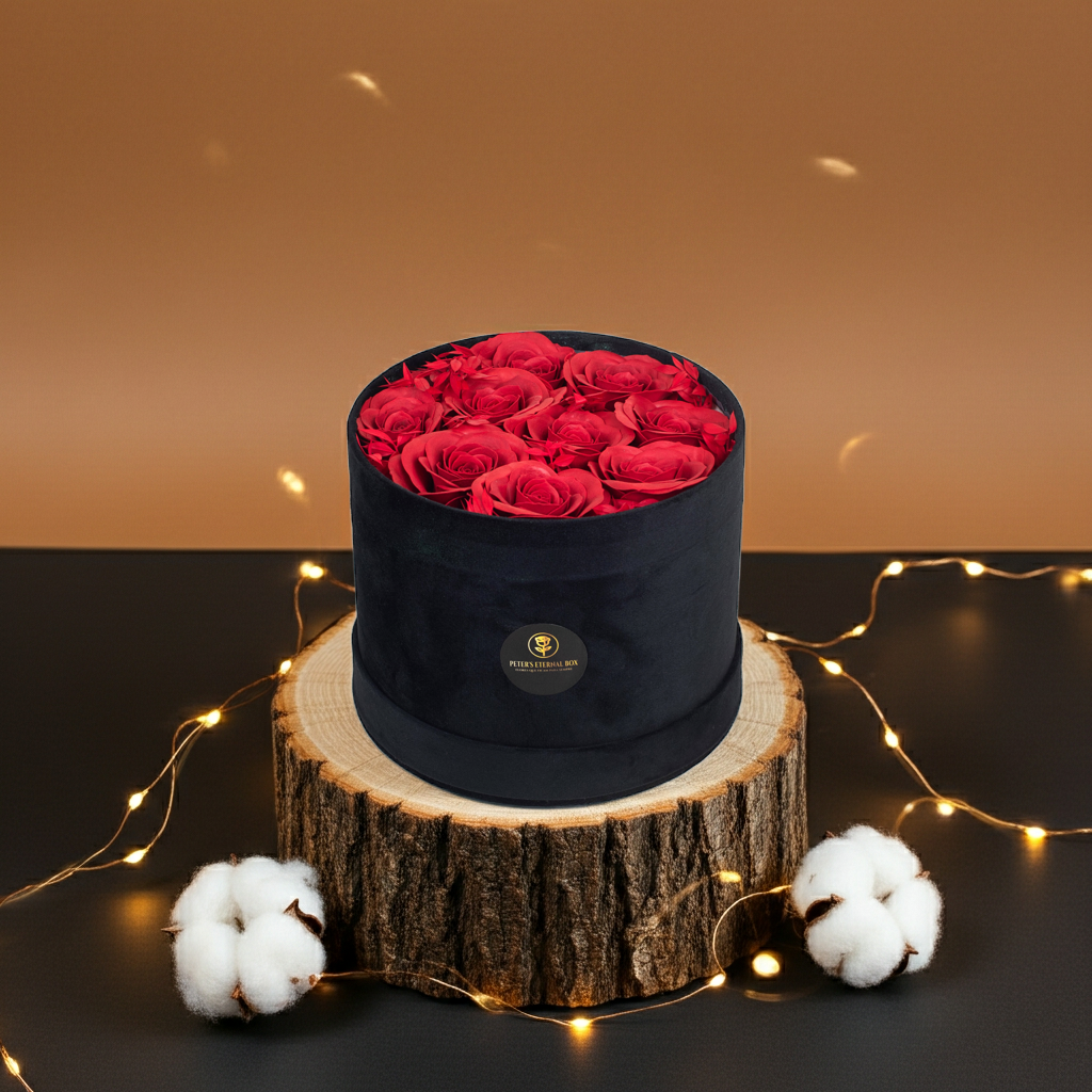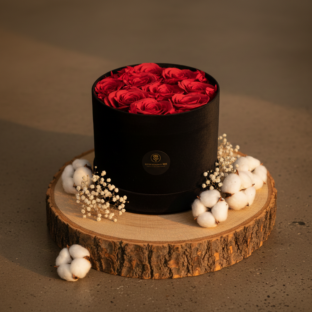 🖤 Luxuosa caixa de veludo preto com rosas eternas em resina — símbolo de amor eterno.